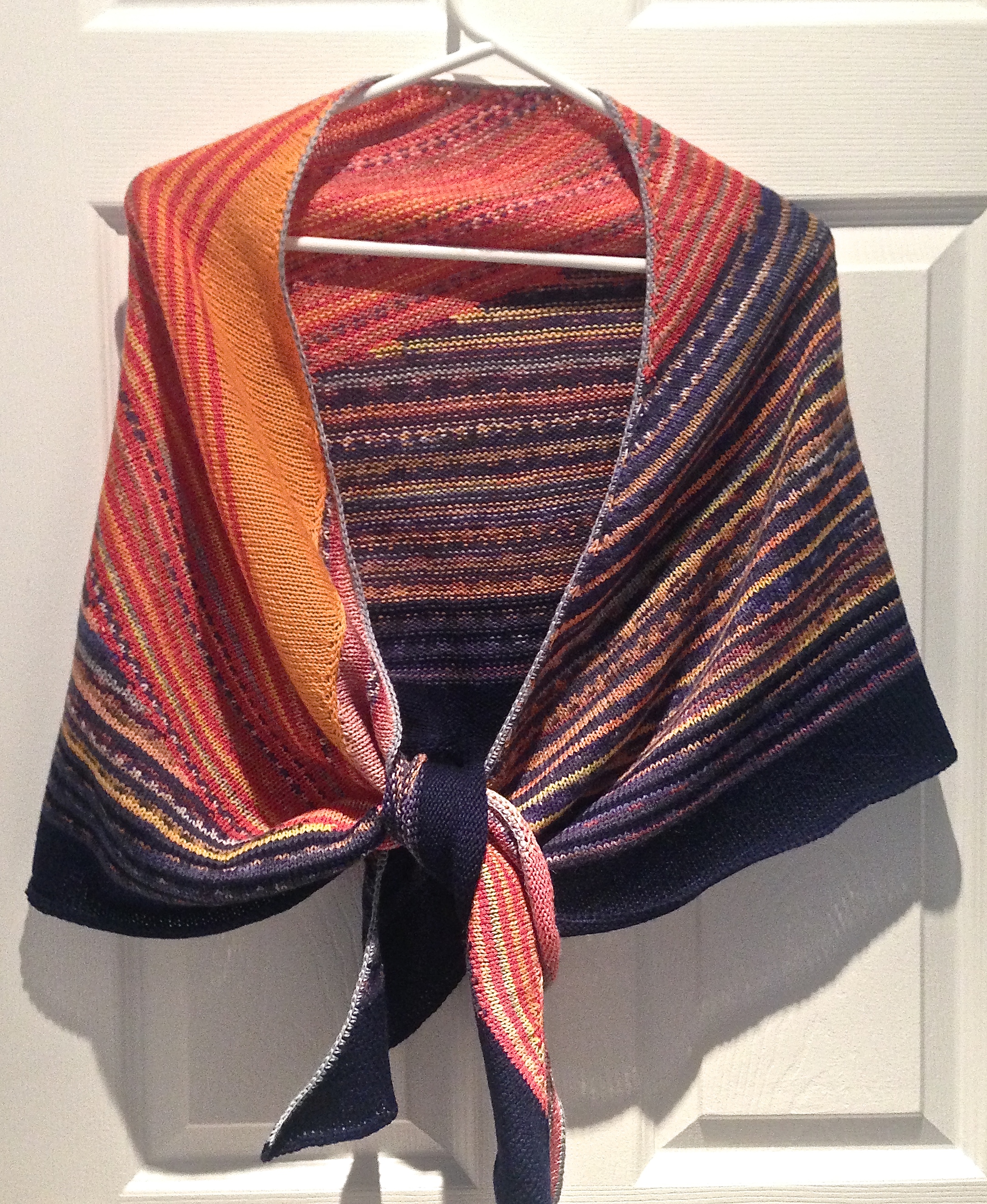 The shawl went quite a bit faster than the original in lace weight yarn, because I was ending up with fewer stitches as the shawl grew longer. However, the neckline went wonky – for some reason the stitch increases at the beginning created a “hump” that made it impossible to wrap the shawl over my shoulder. I filled in part of the hump with leftovers from yet a third pair of socks so the shawl drapes a bit better. Because I used knit and purl rows, there is a definite right and wrong side to the shawl, but the edges also curl. I crocheted a border around the entire shawl to stabilize the edge.