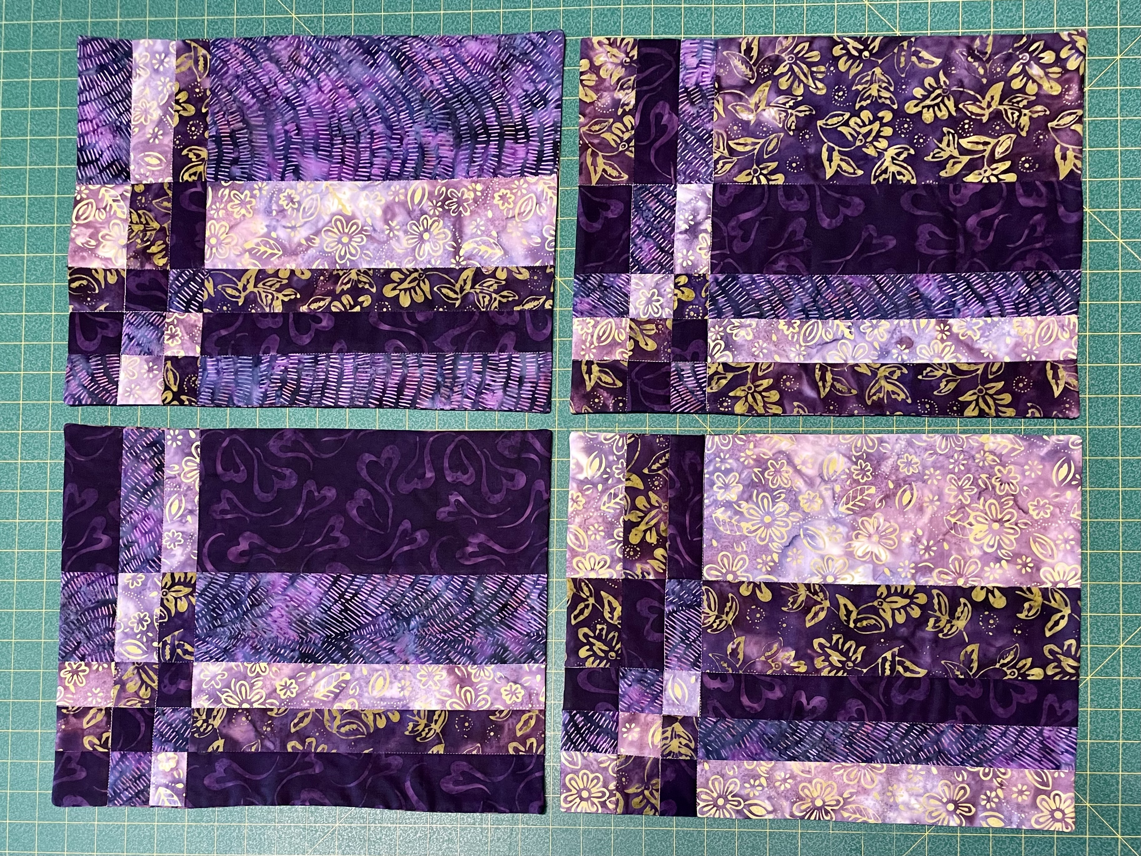 Now I need batting and backing to complete the placemats. I’m still deciding whether to quilt them just by stitching-in-the-ditch along the seam lines, or whether to quilt them in the hoop with a simple design.