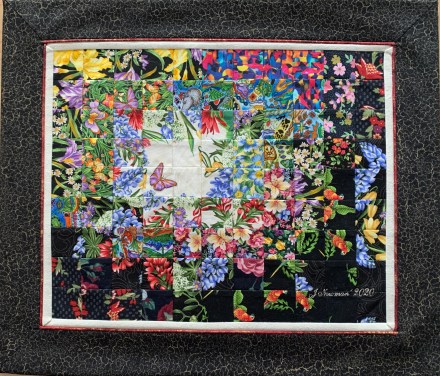 I undertook a second panel for the class – this time I cut my fusible interfacing grid into 8″ strips, taped them to the cutting table, laid out my squares, fused the squares to the interfacing (easy to do because the strips were narrow enough to carry and place on my ironing board), stitched the three panels together, then continued systematically stitching the small blocks – cutting the interfacing as I went so I could press the seams open (which precludes stitching in the ditch as a finishing quilting).