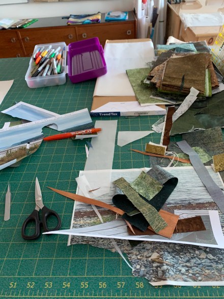 So I think I’m now ready for the Wednesday day-long class. Week 1 we’ll assemble the watercolour/colourwash panel; Week 2 we’ll turn it into a finished textile hanging – inner sashing, piping, outer frame, even an embroidered signature.
