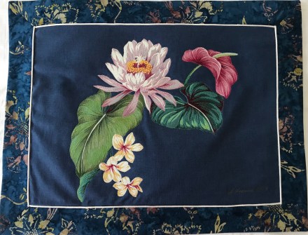 Another thought was to revisit the bark cloth in my stash. I selected an array of hibiscus and heliconia from the black fabric, pressed a sheet of Pellon 805 fusible web to the back, and started fussy-cutting the flowers.
