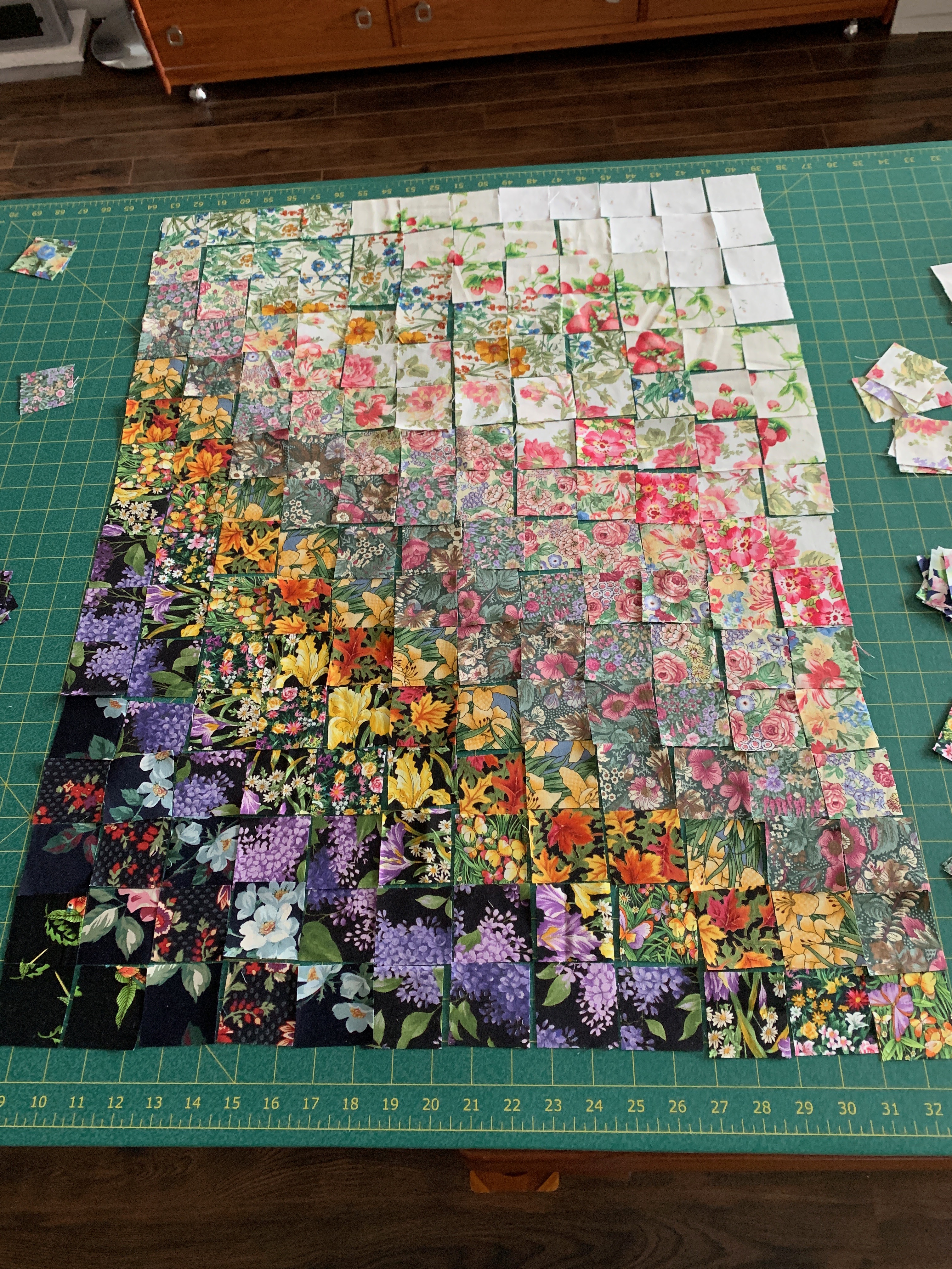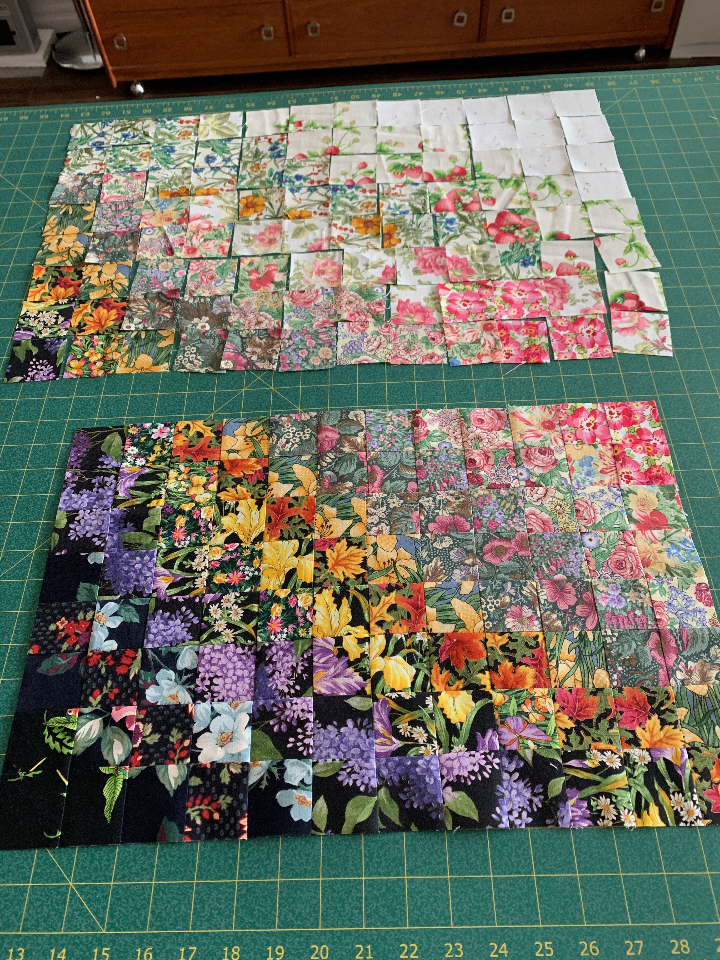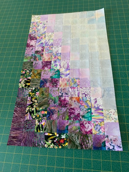 I’m signed up to teach a class in two weeks on colourwash/watercolour quilting. After finishing “Nine Shades Of Grey” two days ago, I opened my box with the gazillion 2″ squares of fabric all nicely colour sorted in ziploc bags and started laying them out.