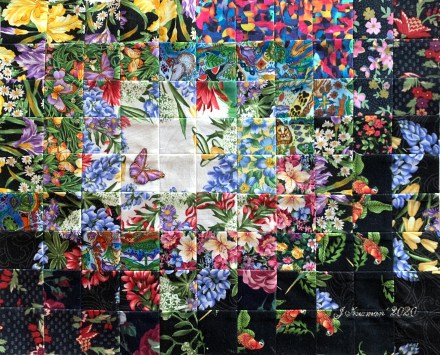 A Second Postscript: I appliquéd a small purple/orange butterfly in the lower left of the light area to provide some kind of focus to the piece. I wish I had more butterfly fabric to choose from – this one is a wee bit on the small side but it was the only size I could find in what I had.