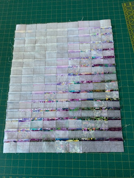 Now I really ran into trouble – I couldn’t press directly on the cutting mat (the heat from the iron would make it buckle). I tried sliding the grid interfacing (with loose squares laid out) onto the ironing board but my board wasn’t wide enough to support the whole piece. Fortunately I had taken photos of the layout so when the bottom half of my squares landed on the floor, I was able to reposition them (more or less) as I’d had them so I could systematically press them all in place. This is clearly a problem I have to solve before the class because I can’t have people struggling to retain the positioning of the squares as they press them onto the grid interfacing!
